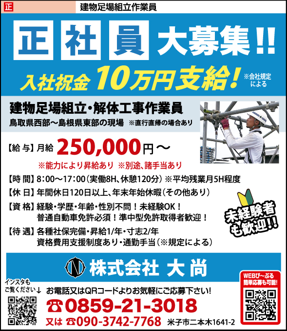- 米子市 《正》建物足場組立・解体作業員 | 株式会社大尚